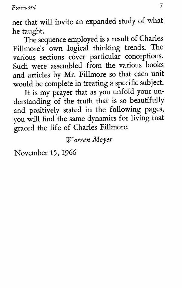 The sequence employed is a result of Charles Fillmore's own logical thinking trends. The various sections cover particular conceptions. Such were assembled from the various books and articles by Mr. Fillmore so that each unit would be complete in treating a specific subject.