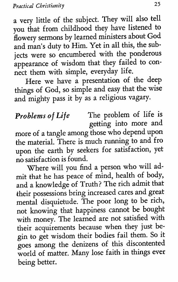 Where will you find a person who will admit that he has peace of mind, health of body, and a knowledge of Truth? The rich admit that their possessions bring increased cares and great mental disquietude. The poor long to be rich, not knowing that happiness cannot be bought with money. The learned are not satisfied with their acquirements because when they just begin to get wisdom their bodies fail them. So it goes among the denizens of this discontented world of matter. Many lose faith in things ever being better.