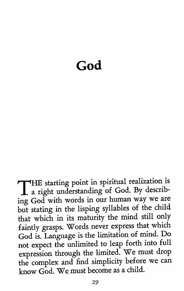 THE starting point in spiritual realization is a right understanding of God. By describing God with words in our human way we are but stating in the lisping syllables of the child that which in its maturity the mind still only faintly grasps. Words never express that which God is. Language is the limitation of mind. Do not expect the unlimited to leap forth into full expression through the limited. We must drop the complex and find simplicity before we can know God. We must become as a child.