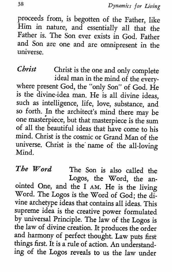 The Son is also called the Logos, the Word, the anointed One, and the I AM. He is the living Word. The Logos is the Word of God; the divine archetype ideas that contains all ideas. This supreme idea is the creative power formulated by universal Principle. The law of the Logos is the law of divine creation. It produces the order and harmony of perfect thought. Law puts first things first. It is a rule of action. An understanding of the Logos reveals to us the law under