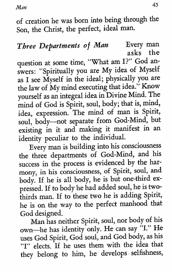 Man has neither Spirit, soul, nor body of his own--he has identity only. He can say "I." He uses God Spirit, God soul, and God body, as his "I" elects. If he uses them with the idea that they belong to him, he develops selfishness