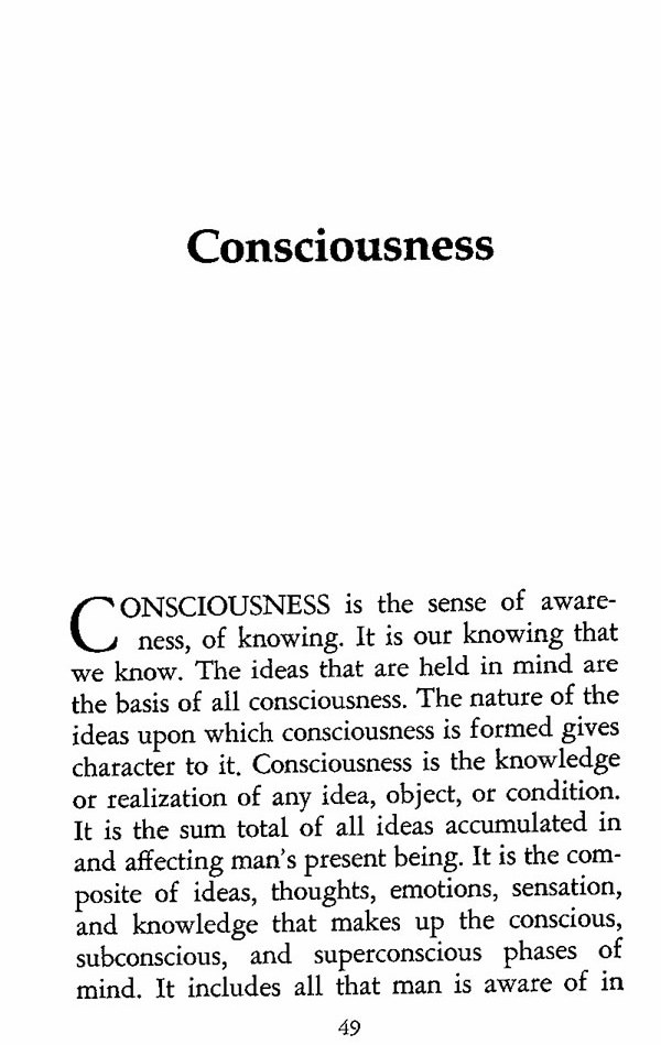 CONSCIOUSNESS is the sense of awareness, of knowing. It is our knowing that we know. The ideas that are held in mind are the basis of all consciousness. The nature of the ideas upon which consciousness is formed gives character to it. Consciousness is the knowledge or realization of any idea, object, or condition. It is the sum total of all ideas accumulated in and affecting man's present being. It is the composite of ideas, thoughts, emotions, sensation, and knowledge that makes up the conscious, subconscious, and superconscious phases of mind. It includes all that man is aware of in