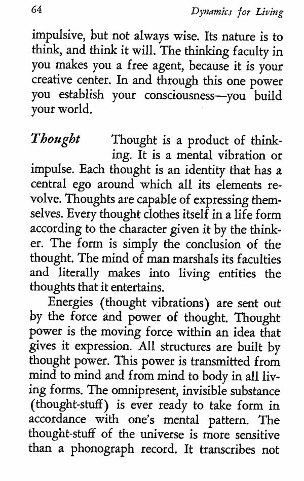 Energies (thought vibrations) are sent out by the force and power of thought. Thought power is the moving force within an idea that gives it expression. All structures are built by thought power. This power is transmitted from mind to mind and from mind to body in all living forms. The omnipresent, invisible substance (thought-stuff) is ever ready to take form in accordance with one's mental pattern. The thought-stuff of the universe is more sensitive than a phonograph record. It transcribes not