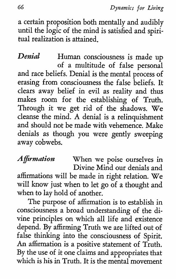 Human consciousness is made up of a multitude of false personal and race beliefs. Denial is the mental process of erasing from consciousness the false beliefs. It clears away belief in evil as reality and thus makes room for the establishing of Truth. Through it we get rid of the shadows. We cleanse the mind. A denial is a relinquishment and should not be made with vehemence. Make denials as though you were gently sweeping away cobwebs.