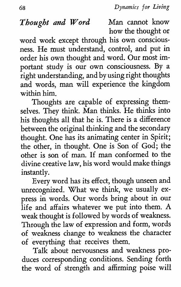 Man cannot know how the thought or word work except through his own consciousness. He must understand, control, and put in order his own thought and word. Our most important study is our own consciousness. By a right understanding, and by using right thoughts and words, man will experience the kingdom within him.