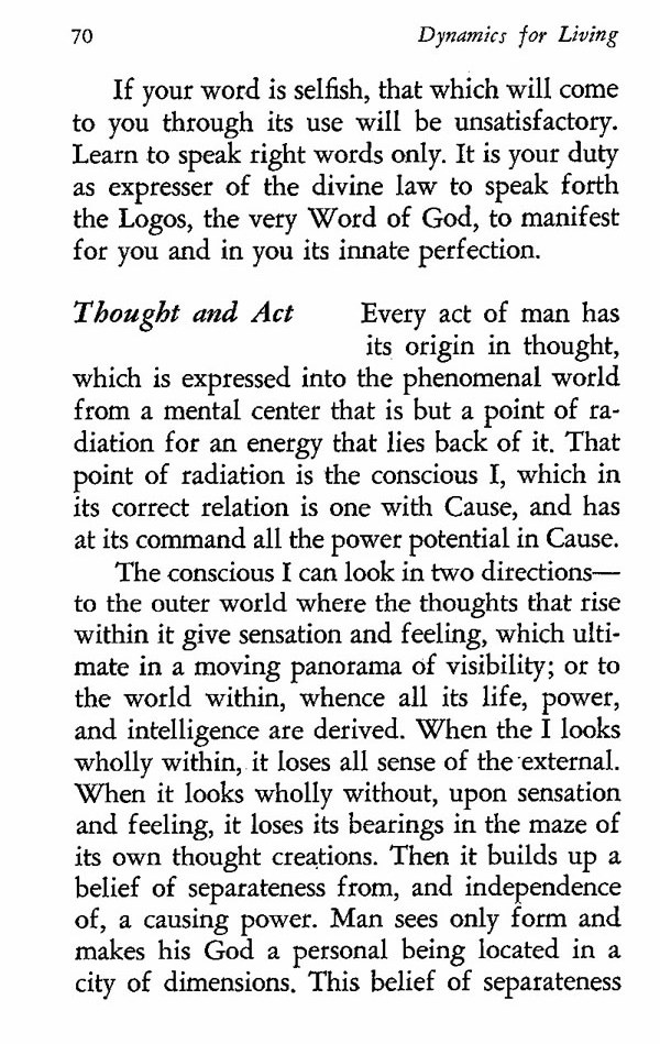 Every act of man has its origin in thought, which is expressed into the phenomenal world from a mental center that is but a point of radiation for an energy that lies back of it. That point of radiation is the conscious I, which in its correct relation is one with Cause, and has at its command all the power potential in Cause.