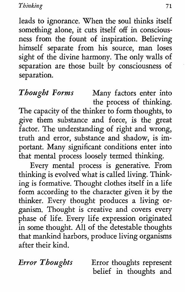 Every mental process is generative. From thinking is evolved what is called living. Thinking is formative. Thought clothes itself in a life form according to the character given it by the thinker. Every thought produces a living organism. Thought is creative and covers every phase of life. Every life expression originated in some thought. All of the detestable thoughts that mankind harbors, produce living organisms after their kind.
