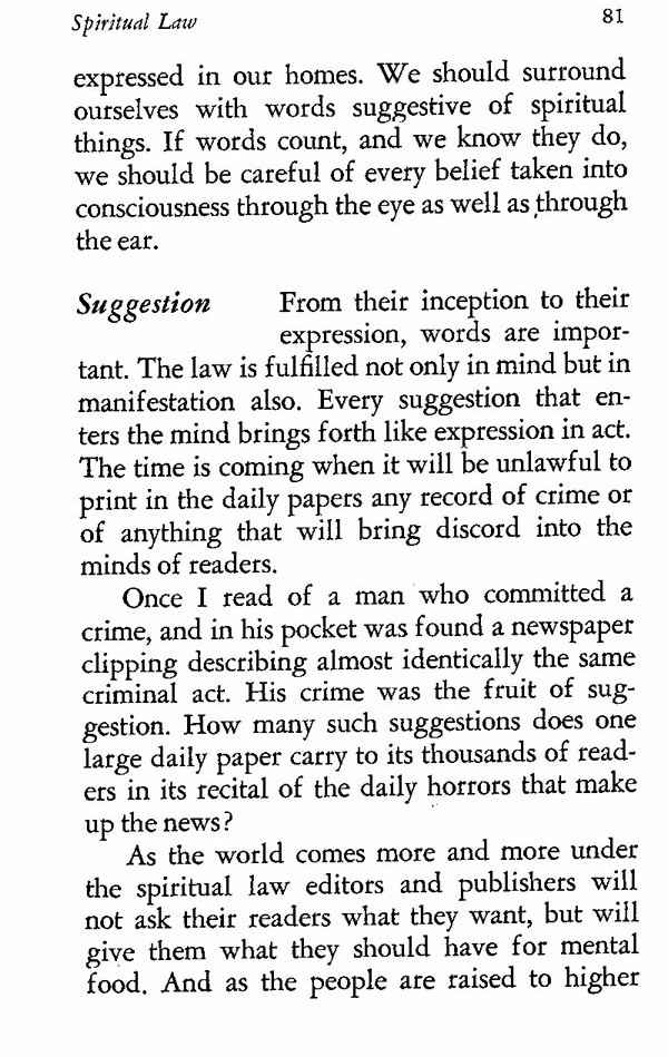 From their inception to their expression, words are important. The law is fulfilled not only in mind but in manifestation also. Every suggestion that enters the mind brings forth like expression in act. The time is coming when it will be unlawful to print in the daily papers any record of crime or of anything that will bring discord into the minds of readers.