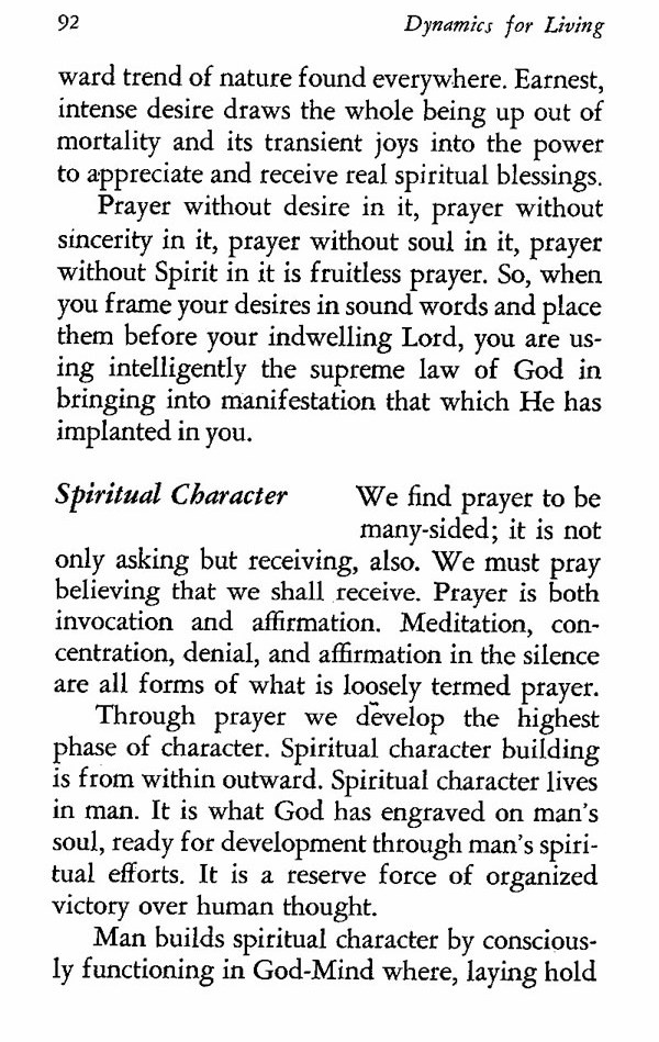 Through prayer we develop the highest phase of character. Spiritual character building is from within outward. Spiritual character lives in man. It is what God has engraved on man's soul, ready for development through man's spiritual efforts. It is a reserve force of organized victory over human thought.