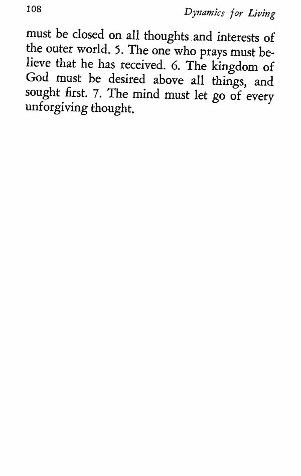 must be closed on all thoughts and interests of the outer world. 5. The one who prays must believe that he has received. 6. The kingdom of God must be desired above all things, and sought first. 7. The mind must let go of every unforgiving thought.