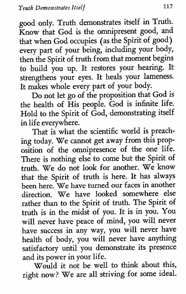 good only. Truth demonstrates itself in Truth. Know that God is the omnipresent good, and that when God occupies (as the Spirit of good) every part of your being, including your body, then the Spirit of truth from that moment begins to build you up. It restores your hearing. It strengthens your eyes. It heals your lameness. It makes whole every part of your body.