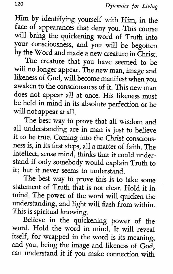 Him by identifying yourself with Him, in the face of appearances that deny you. This course will bring the quickening word of Truth into your consciousness, and you will be begotten by the Word and made a new creature in Christ.
