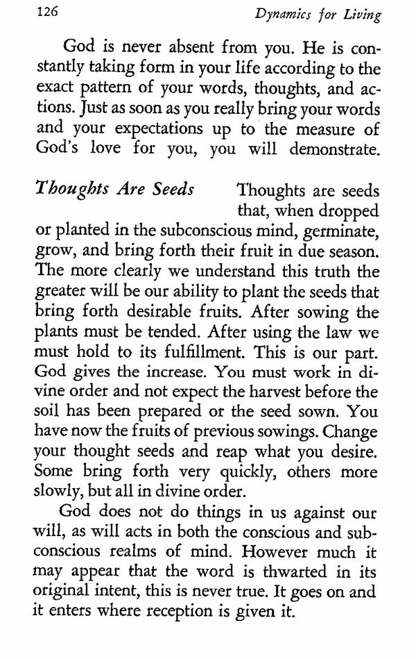 Thoughts are seeds that, when dropped or planted in the subconscious mind, germinate, grow, and bring forth their fruit in due season. The more clearly we understand this truth the greater will be our ability to plant the seeds that bring forth desirable fruits. After sowing the plants must be tended. After using the law we must hold to its fulfillment. This is our part. God gives the increase. You must work in divine order and not expect the harvest before the soil has been prepared or the seed sown. You have now the fruits of previous sowings. Change your thought seeds and reap what you desire. Some bring forth very quickly, others more slowly, but all in divine order.