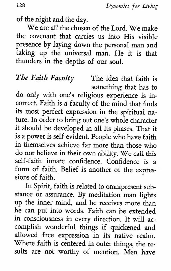 The idea that faith is something that has to do only with one's religious experience is incorrect. Faith is a faculty of the mind that finds its most perfect expression in the spiritual nature. In order to bring out one's whole character it should be developed in all its phases. That it is a power is self-evident. People who have faith in themselves achieve far more than those who do not believe in their own ability. We call this self-faith innate confidence. Confidence is a form of faith. Belief is another of the expressions of faith.