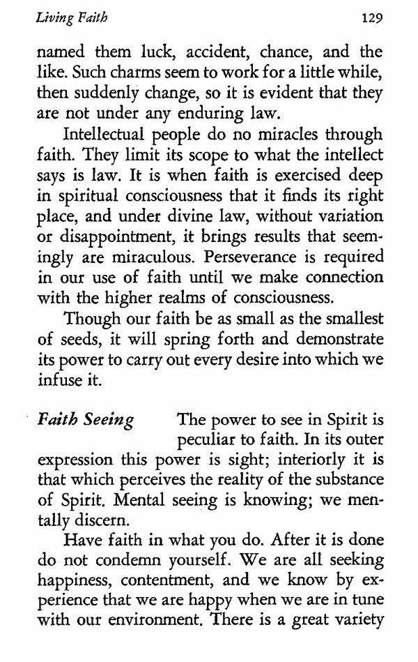 Intellectual people do no miracles through faith. They limit its scope to what the intellect says is law. It is when faith is exercised deep in spiritual consciousness that it finds its right place, and under divine law, without variation or disappointment, it brings results that seemingly are miraculous. Perseverance is required in our use of faith until we make connection with the higher realms of consciousness.