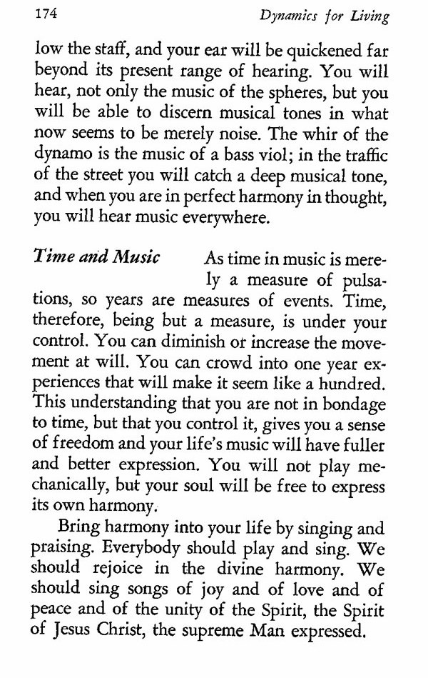 As time in music is merely a measure of pulsations, so years are measures of events. Time, therefore, being but a measure, is under your control. You can diminish or increase the movement at will. You can crowd into one year experiences that will make it seem like a hundred. This understanding that you are not in bondage to time, but that you control it, gives you a sense of freedom and your life's music will have fuller and better expression. You will not play mechanically, but your soul will be free to express its own harmony.