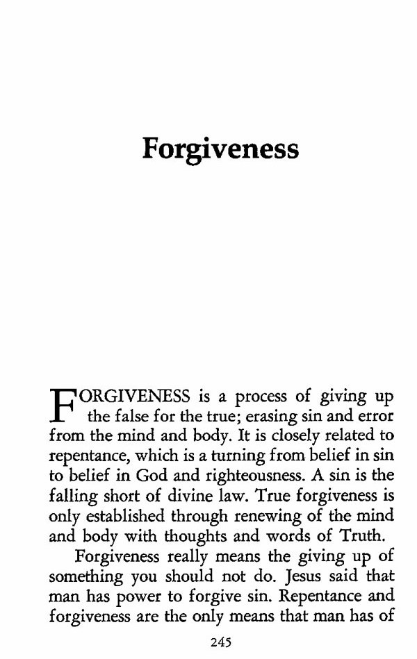 FORGIVENESS is a process of giving up the false for the true; erasing sin and error from the mind and body. It is closely related to repentance, which is a turning from belief in sin to belief in God and righteousness. A sin is the falling short of divine law. True forgiveness is only established through renewing of the mind and body with thoughts and words of Truth.
