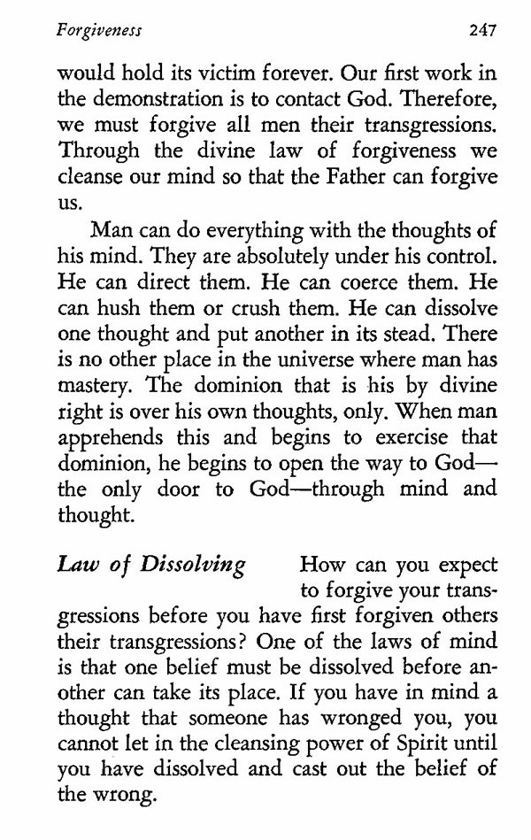 How can you expect to forgive your transgressions before you have first forgiven others their transgressions? One of the laws of mind is that one belief must be dissolved before another can take its place. If you have in mind a thought that someone has wronged you, you cannot let in the cleansing power of Spirit until you have dissolved and cast out the belief of the wrong.
