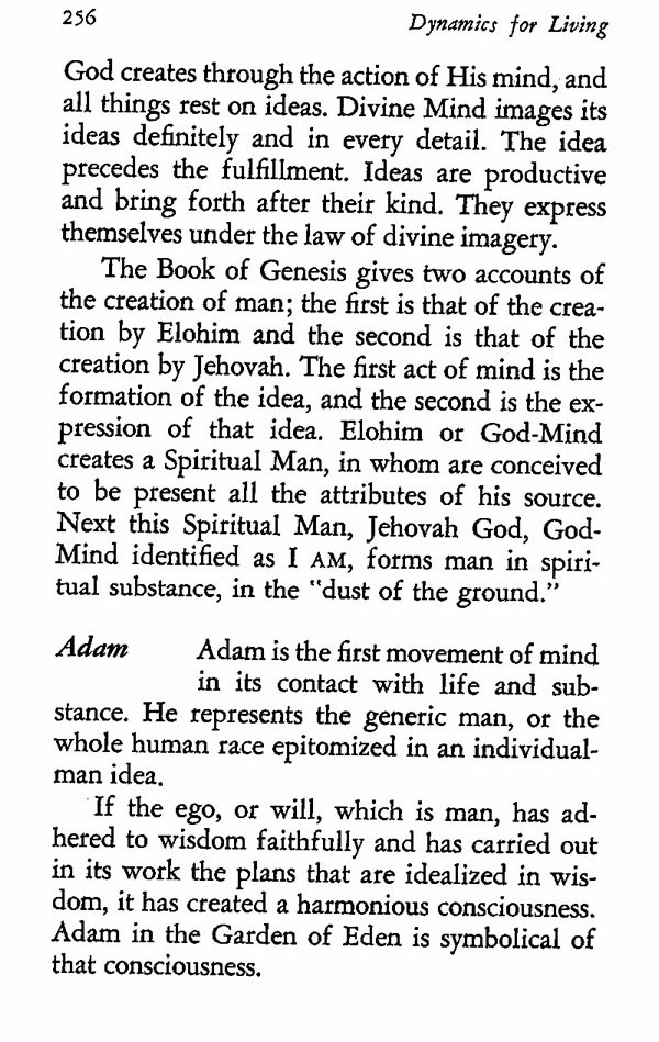 The Book of Genesis gives two accounts of the creation of man; the first is that of the creation by Elohim and the second is that of the creation by Jehovah. The first act of mind is the formation of the idea, and the second is the expression of that idea. Elohim or God-Mind creates a Spiritual Man, in whom are conceived to be present all the attributes of his source. Next this Spiritual Man, Jehovah God, God-Mind identified as I AM, forms man in spiritual substance, in the "dust of the ground."