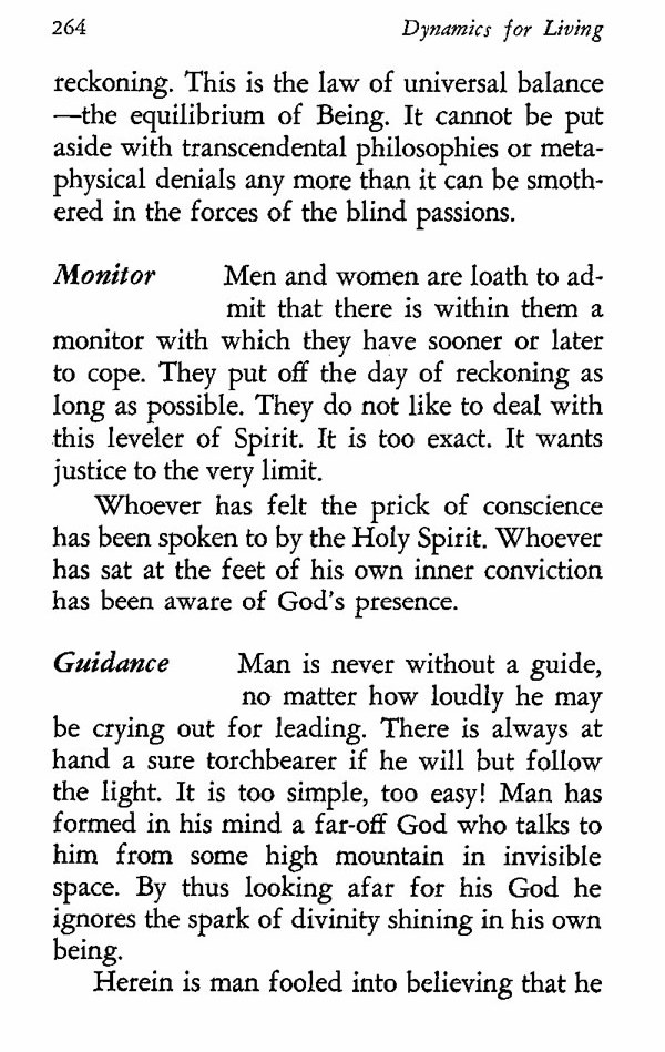 Men and women are loath to admit that there is within them a monitor with which they have sooner or later to cope. They put off the day of reckoning as long as possible. They do not like to deal with this leveler of Spirit. It is too exact. It wants justice to the very limit.