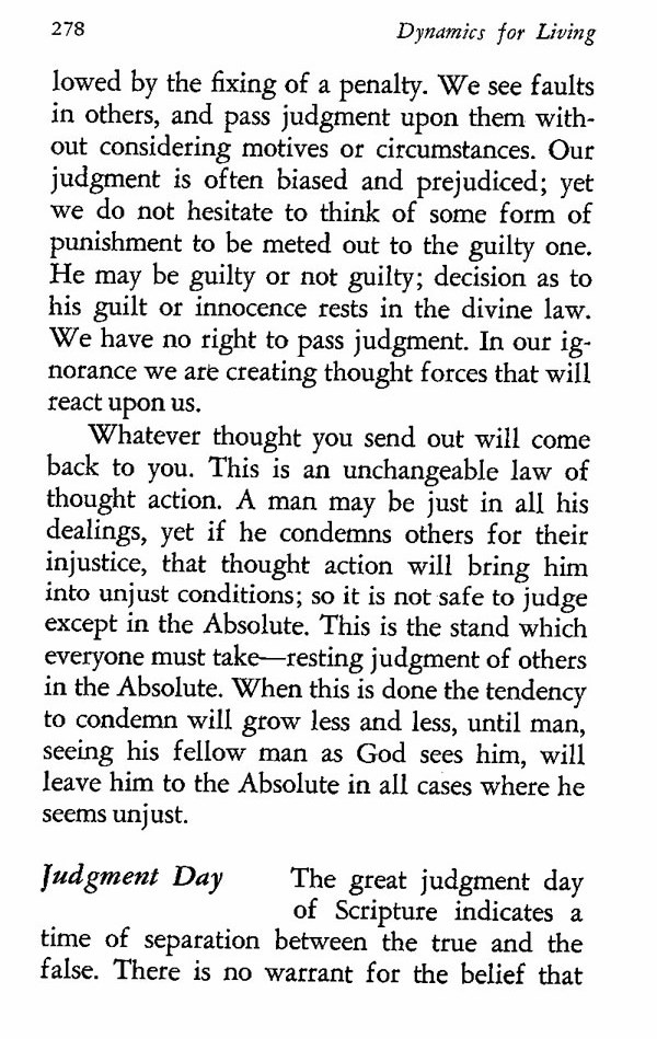 by the fixing of a penalty. We see faults in others, and pass judgment upon them without considering motives or circumstances. Our judgment is often biased and prejudiced; yet we do not hesitate to think of some form of punishment to be meted out to the guilty one. He may be guilty or not guilty; decision as to his guilt or innocence rests in the divine law. We have no right to pass judgment. In our ignorance we are creating thought forces that will react upon us.