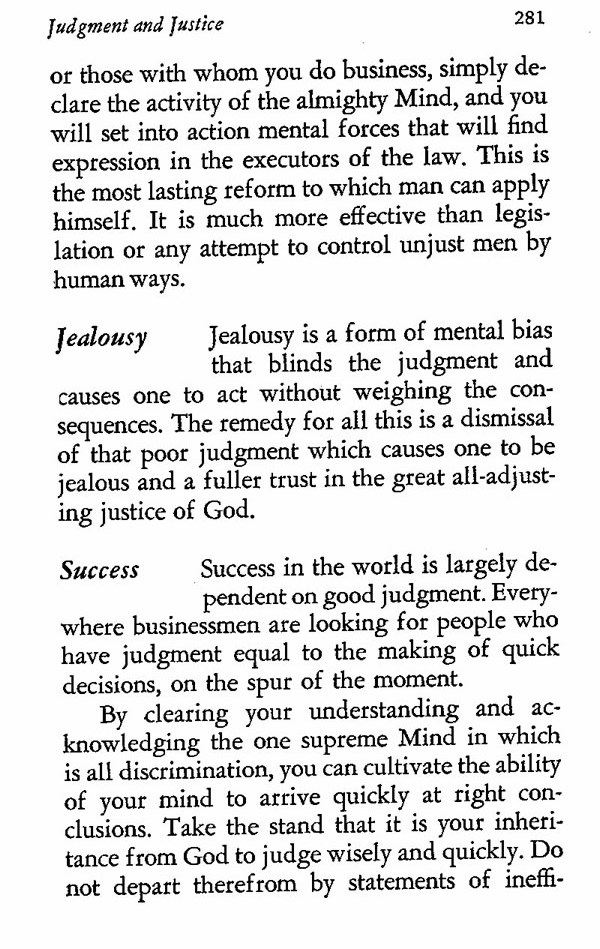 or those with whom you do business, simply declare the activity of the almighty Mind, and you will set into action mental forces that will find expression in the executors of the law. This is the most lasting reform to which man can apply himself. It is much more effective than legislation or any attempt to control unjust men by human ways.