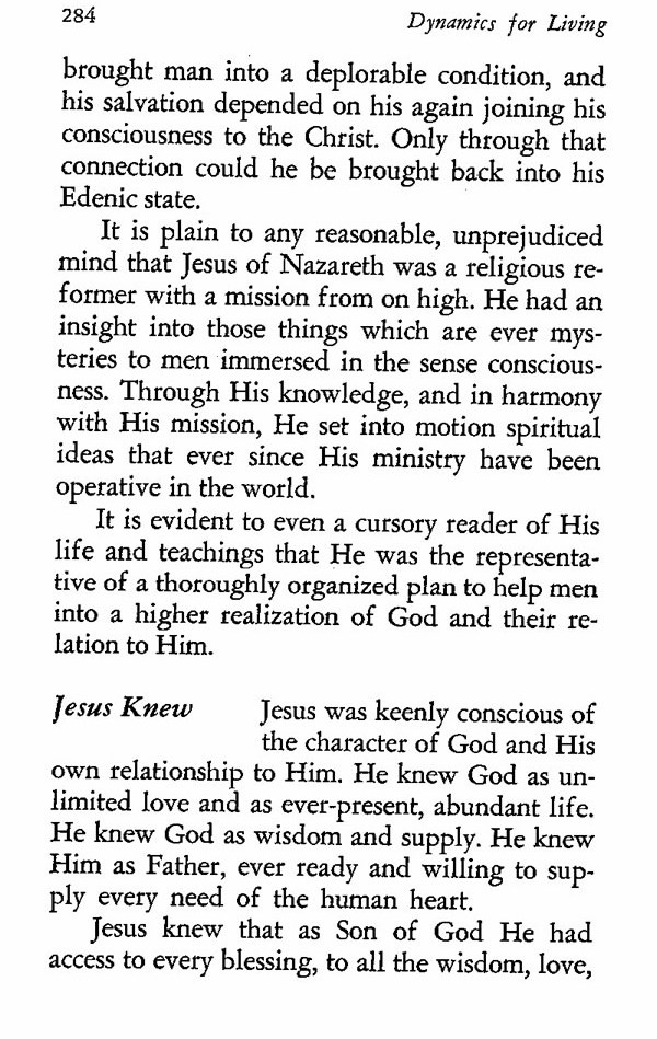 Jesus was keenly conscious of the character of God and His own relationship to Him. He knew God as unlimited love and as ever-present, abundant life. He knew God as wisdom and supply. He knew Him as Father, ever ready and willing to supply every need of the human heart.