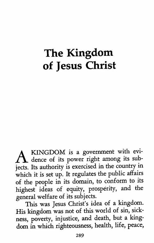 This was Jesus Christ's idea of a kingdom. His kingdom was not of this world of sin, sickness, poverty, injustice, and death, but a kingdom in which righteousness, health, life, peace,