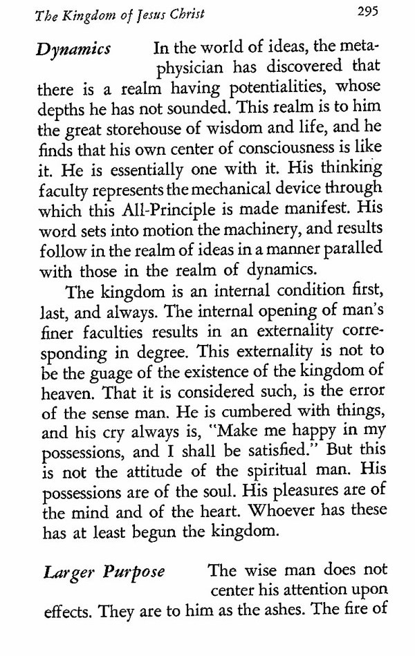 The kingdom is an internal condition first, last, and always. The internal opening of man's finer faculties results in an externality corresponding in degree. This externality is not to be the gauge of the existence of the kingdom of heaven. That it is considered such, is the error of the sense man. He is cumbered with things, and his cry always is, "Make me happy in my possessions, and I shall be satisfied." But this is not the attitude of the spiritual man. His possessions are of the soul. His pleasures are of the mind and of the heart. Whoever has these has at least begun the kingdom.