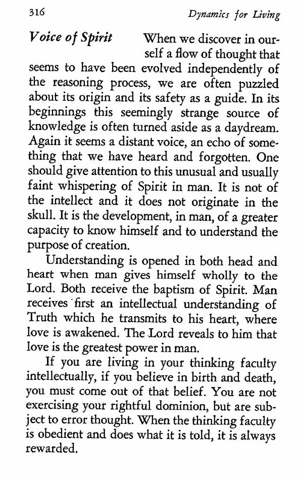 When we discover in ourself a flow of thought that seems to have been evolved independently of the reasoning process, we are often puzzled about its origin and its safety as a guide. In its beginnings this seemingly strange source of knowledge is often turned aside as a daydream. Again it seems a distant voice, an echo of something that we have heard and forgotten. One should give attention to this unusual and usually faint whispering of Spirit in man. It is not of the intellect and it does not originate in the skull. It is the development, in man, of a greater capacity to know himself and to understand the purpose of creation.