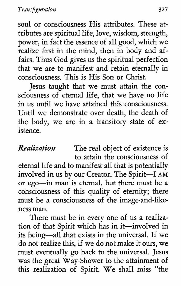 Jesus taught that we must attain the consciousness of eternal life, that we have no life in us until we have attained this consciousness. Until we demonstrate over death, the death of the body, we are in a transitory state of existence.