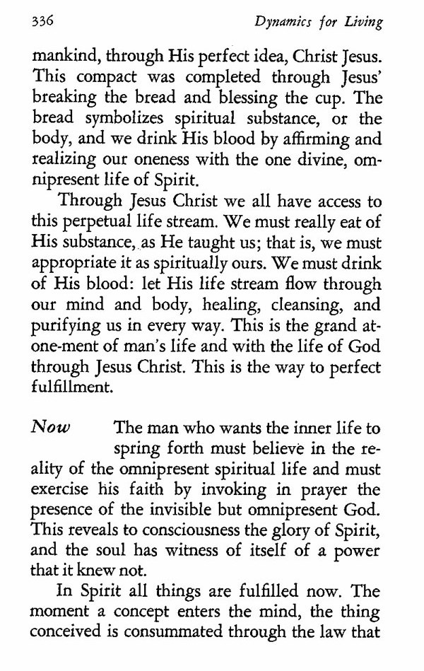 mankind, through His perfect idea, Christ Jesus. This compact was completed through Jesus' breaking the bread and blessing the cup. The bread symbolizes spiritual substance, or the body, and we drink His blood by affirming and realizing our oneness with the one divine, omnipresent life of Spirit.