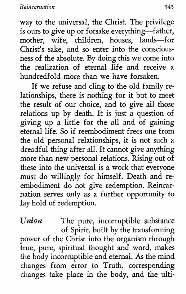way to the universal, the Christ. The privilege is ours to give up or forsake everything--father, mother, wife, children, houses, lands--for Christ's sake, and so enter into the consciousness of the absolute. By doing this we come into the realization of eternal life and receive a hundredfold more than we have forsaken.