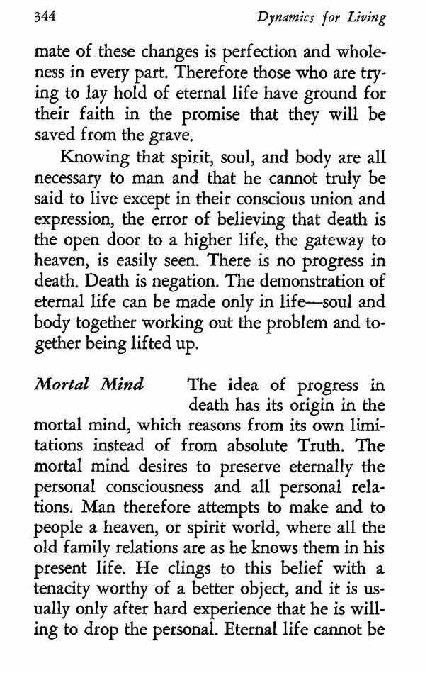 The idea of progress in death has its origin in the mortal mind, which reasons from its own limitations instead of from absolute Truth. The mortal mind desires to preserve eternally the personal consciousness and all personal relations. Man therefore attempts to make and to people a heaven, or spirit world, where old family relations are as he knows them in his present life. He clings to this belief with a tenacity worthy of a better object, and it is usually only after hard experience that he is willing to drop the personal. Eternal life cannot be