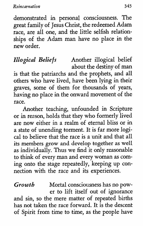 Another teaching, unfounded in Scripture or in reason, holds that they who formerly lived are now either in a realm of eternal bliss or in a state of unending torment. It is far more logical to believe that the race is a unit and that all its members grow and develop together as well as individually. Thus we find it only reasonable to think of every man and every woman as coming onto the stage repeatedly, keeping up connection with the race and its experiences.