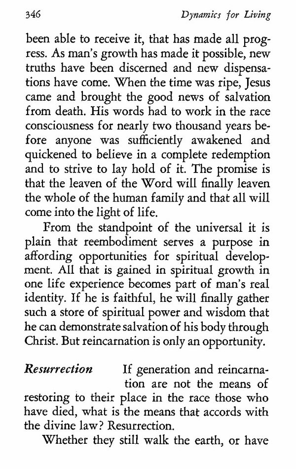 From the standpoint of the universal it is plain that reembodiment serves a purpose in affording opportunities for spiritual development. All that is gained in spiritual growth in one life experience becomes part of man's real identity. If he is faithful, he will finally gather such a store of spiritual power and wisdom that he can demonstrate salvation of his body through Christ. But reincarnation is only an opportunity.