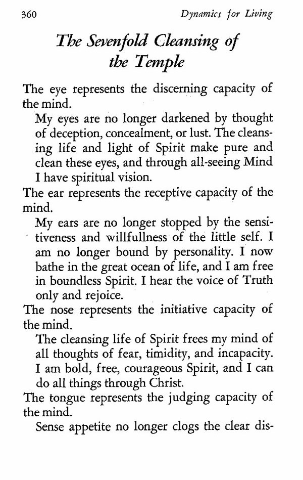 My eyes are no longer darkened by thought of deception, concealment, or lust. The cleansing life and light of Spirit make pure and clean these eyes, and through all-seeing Mind I have spiritual vision.
