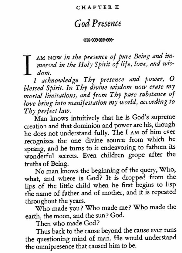 I acknowledge Thy presence and power, O blessed Spirit. In Thy divine wisdom now erase my mortal limitations, and from Thy pure substance of love bring into manifestation my world, according to Thy perfect law.