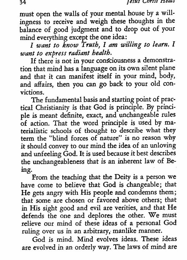 The fundamental basis and starting point of practical Christianity is that God is principle. By principle is meant definite, exact, and unchangeable rules of action. That the word principle is used by materialistic schools of thought to describe what they term the "blind forces of nature" is no reason why it should convey to our minds the idea of an unloving and unfeeling God. It is used because it best describes the unchangeableness that is an inherent law of Being.