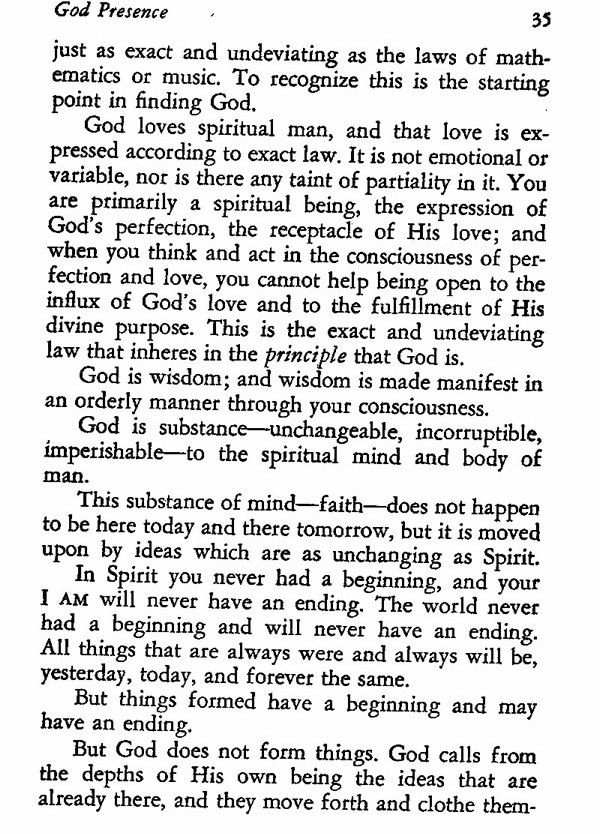 God loves spiritual man, and that love is expressed according to exact law. It is not emotional or variable, nor is there any taint of partiality in it. You are primarily a spiritual being, the expression of God's perfection, the receptacle of His love; and when you think and act in the consciousness of perfection and love, you cannot help being open to the influx of God's love and to the fulfillment of His divine purpose. This is the exact and undeviating law that inheres in the principle that God is.