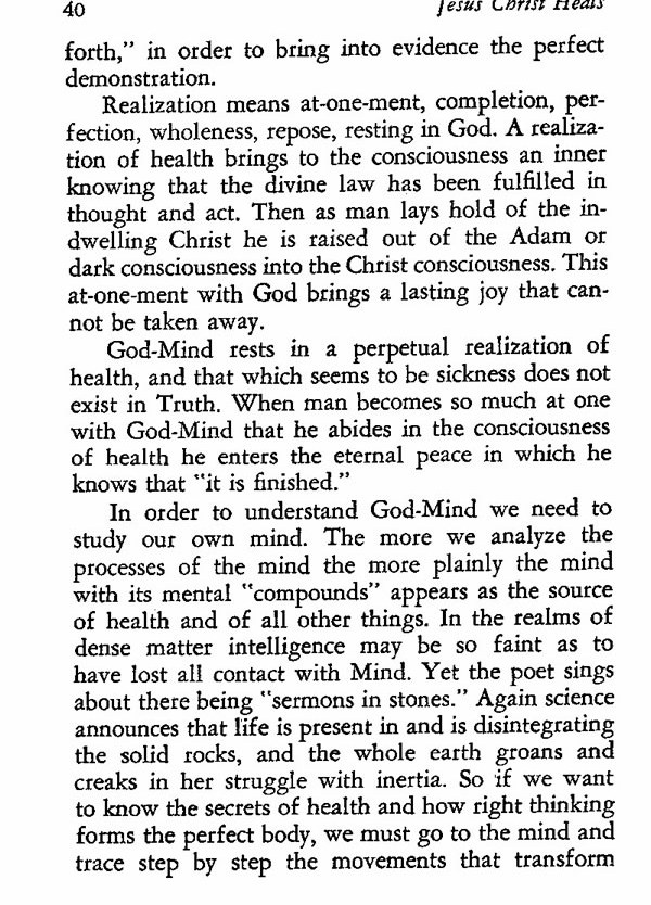 In order to understand God-Mind we need to study our own mind. The more we analyze the processes of the mind the more plainly the mind with its mental "compounds" appears as the source of health and of all other things. In the realms of dense matter intelligence may be so faint as to have lost all contact with Mind. Yet the poet sings about there being "sermons in stones." Again science announces that life is present in and is disintegrating the solid rocks and the whole earth groans and creaks in her struggle with inertia. So if we want to know the secrets of health and how right thinking forms the perfect body, we must go to the mind and trace step by step the movements that transform