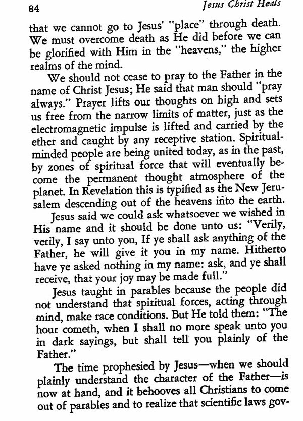 We should not cease to pray to the Father in the name of Christ Jesus; He said that man should "pray always." Prayer lifts our thoughts on high and sets us free from the narrow limits of matter, just as the electromagnetic impulse is lifted and carried by the ether and caught by any receptive station. Spiritual-minded people are being united today, as in the past, by zones of spiritual force that will eventually become the permanent thought atmosphere of the planet. In Revelation this is typified as the New Jerusalem descending out of the heavens into the earth.