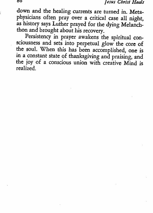 Persistency in prayer awakens the spiritual consciousness and sets into perpetual glow the core of the soul. When this has been accomplished, one is in a constant state of thanksgiving and praising, and the joy of a conscious union with creative Mind is realized.