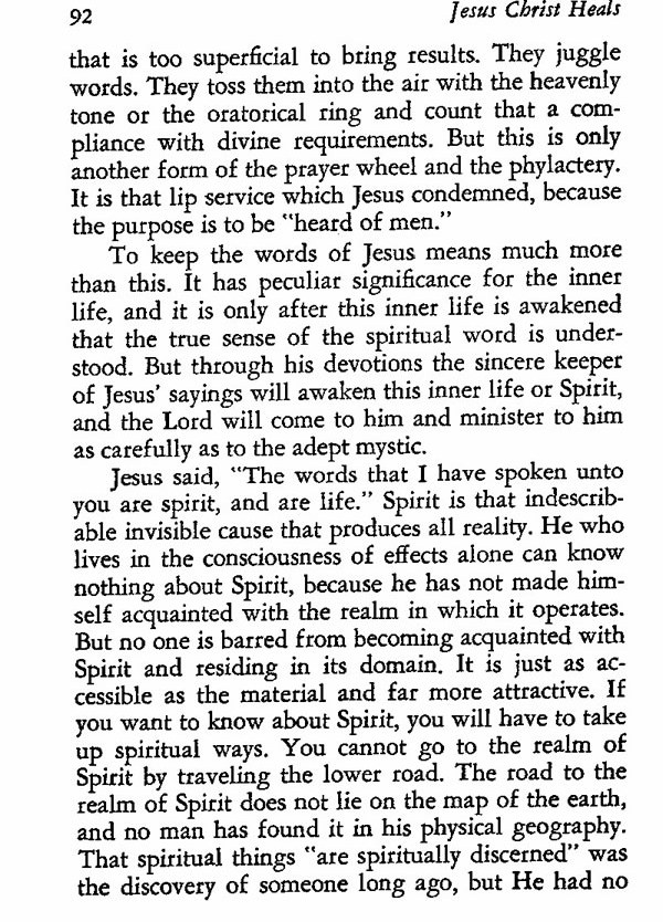 Jesus said, "The words that I have spoken unto you are spirit, and are life." Spirit is that indescribable invisible cause that produces all reality. He who lives in the consciousness of effects alone can know nothing about Spirit, because he has not made himself acquainted with the realm in which it operates. But no one is barred from becoming acquainted with Spirit and residing in its domain. It is just as accessible as the material and far more attractive. If you want to know about Spirit, you will have to take up spiritual ways. You cannot go to the realm of Spirit by traveling the lower road. The road to the realm of Spirit does not lie on the map of the earth, and no man has found it in his physical geography. That spiritual things "are spiritually discerned" was the discovery of someone long ago, but he had no copyright on it. To him it was a revelation, just as it