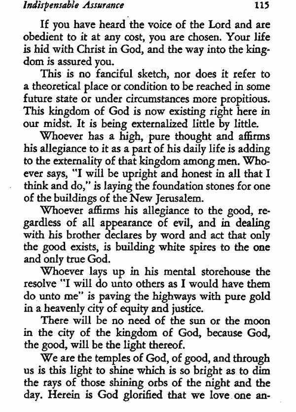 This is no fanciful sketch, nor does it refer to a theoretical place or condition to be reached in some future state or under circumstances more propitious. This kingdom of God is now existing right here in our midst. It is being externalized little by little.