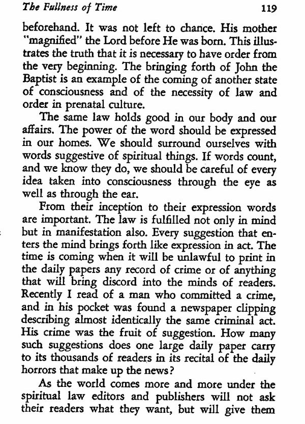 From their inception to their expression words are important. The law is fulfilled not only in mind but in manifestation also. Every suggestion that enters the mind brings forth like expression in act. The time is coming when it will be unlawful to print in the daily papers any record of crime or of anything that will bring discord into the minds of readers. Recently I read of a man who committed a crime, and in his pocket was found a newspaper clipping describing almost identically the same criminal act. His crime was the fruit of suggestion. How many such suggestions does one large daily paper carry to its thousands of readers in its recital of the daily horrors that make up the news?