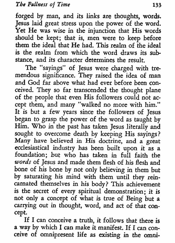 The "sayings" of Jesus were charged with tremendous significance. They raised the idea of man and God far above what had ever before been conceived. They so far transcended the thought plane of the people that even His followers could not accept them, and many "walked no more with him." It is but a few years since the followers of Jesus began to grasp the power of the word as taught by Him. Who in the past has taken Jesus literally and sought to overcome death by keeping His sayings? Many have believed in His doctrine, and a great ecclesiastical industry has been built upon it as a foundation; but who has taken in full faith the words of Jesus and made them flesh of his flesh and bone of his bone by not only believing in them but by saturating his mind with them until they reincarnated themselves in his body? This achievement is the secret of every spiritual demonstration; it is not only a concept of what is true of Being but a carrying out in thought, word, and act of that concept.