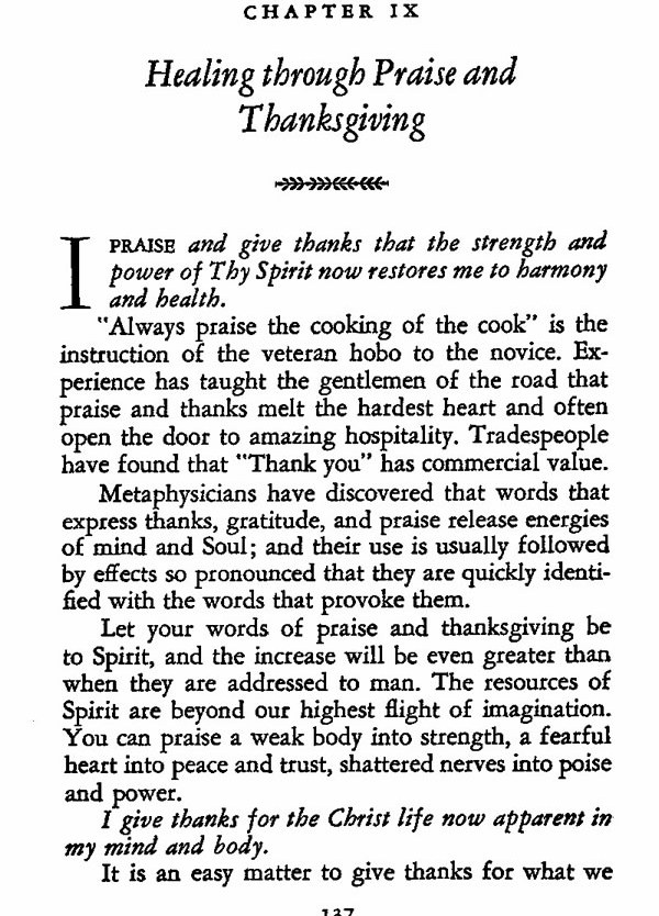 Metaphysicians have discovered that words which express thanks, gratitude, and praise release mind energy of mind and Soul; and their use is usually followed by effects so pronounced that they are quickly identified with the words that provoke them.