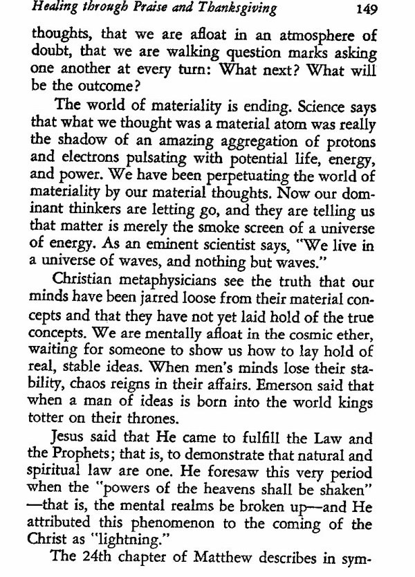 The world of materiality is ending. Science says that what we thought was a material atom was really the shadow of an amazing aggregation of protons and electrons pulsating with potential life, energy, and power. We have been perpetuating the world of materiality by our material thoughts. Now our dominant thinkers are letting go, and they are telling us that matter is merely the smoke screen of a universe of energy. As an eminent scientist says, "We live in a universe of waves, and nothing but waves."