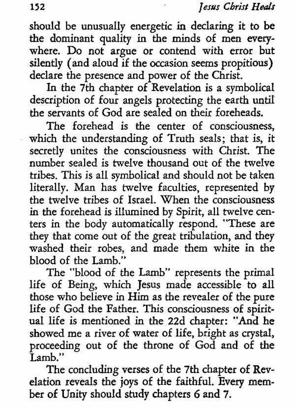 The forehead is the center of consciousness, which the understanding of Truth seals; that is, it secretly unites the consciousness with Christ. The number sealed is twelve thousand out of the twelve tribes. This is all symbolical and should not be taken literally. Man has twelve faculties, represented by the twelve tribes of Israel. When the consciousness in the forehead is illumined by Spirit, all twelve centers in the body automatically respond. "These are they that come out of the great tribulation, and they washed their robes, and made them white in the blood of the Lamb."